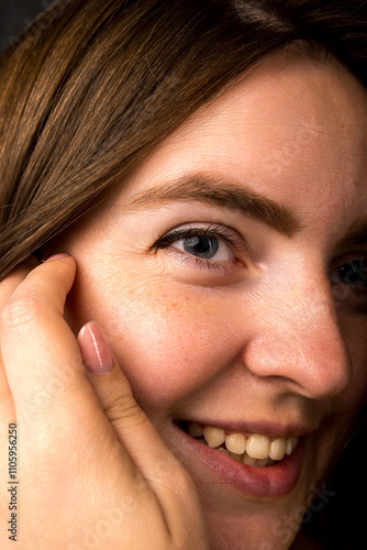Portrait of a woman with natural beauty, showcasing radiant skin, soft freckles, and a bright smile. A positive and relatable image for advertising cosmetics or personal care