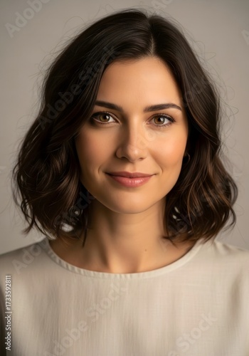 Portrait of a woman with short wavy hair and brown eyes smiling gently at the camera in studio light