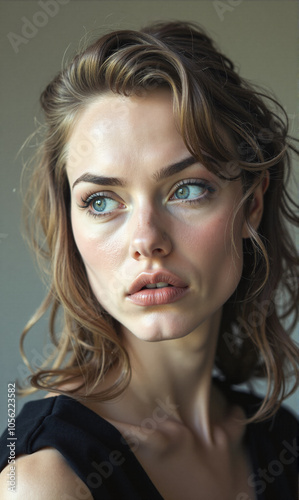 Portrait of a woman with wavy hair and striking blue eyes, captured in soft natural light against a neutral background