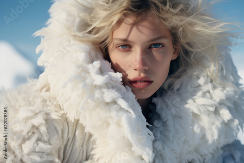 portrait of a woman/model/book character in a cold winter setting with warm white clothes close-up fashion/beauty editorial magazine style film photography look - generative ai art