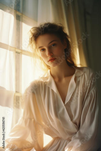 portrait of a woman/model/book character standing by a window in warm daylight with a thoughtful/sad expression in a fashion/beauty editorial magazine style film photography look - generative ai art
