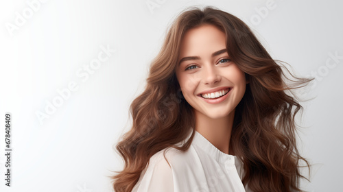 Portrait of a young and beautiful brunette woman on white background, smiles and laughs to the camera. Advertising concept.