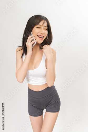 Portrait of a young and sexy beautiful asian female lady model with nice body shape wearing white tops and grey pants talking, selfie, video call and chit chat over a mobile phone