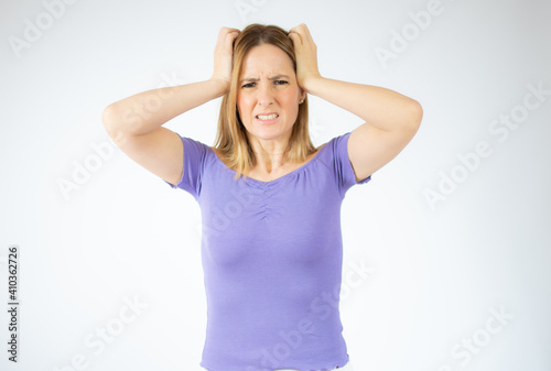 Portrait of a young angry woman over white background.