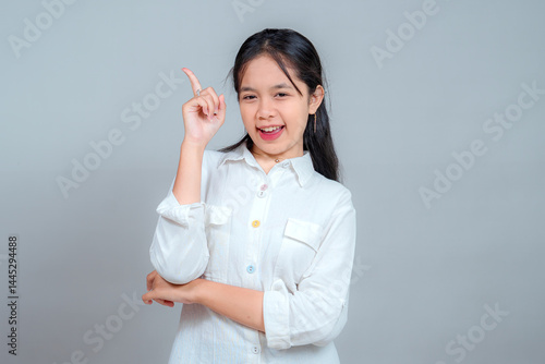 Portrait of a young Asian woman with a bright, cheerful expression, smiling and pointing up with her index finger, symbolizing a creative idea or sudden inspiration on a plain background.