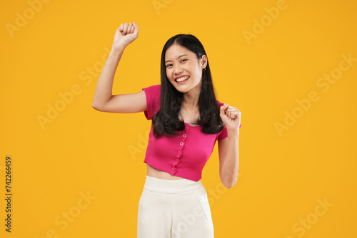 Portrait of a young Asian woman with a toothy smile raised hands and showing a successful sign, wearing a pink t-shirt and isolated on a yellow background.