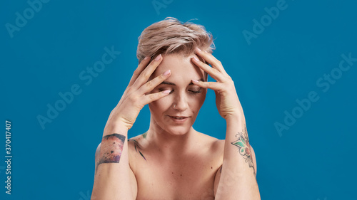 Portrait of a young attractive half naked tattooed woman with perfect skin looking down with hands over her forehead isolated over blue background