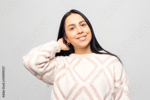 Portrait of a young beautiful cute brunette girl in a warm winter sweater on light gray background.