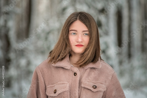 Portrait of a young beautiful girl in the snow in winter outdoors.
