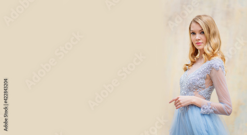 Portrait of a young blonde woman in a delicate blue wedding dress against a beige wall