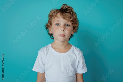 Portrait of a young boy in a white t-shirt against a turquoise background