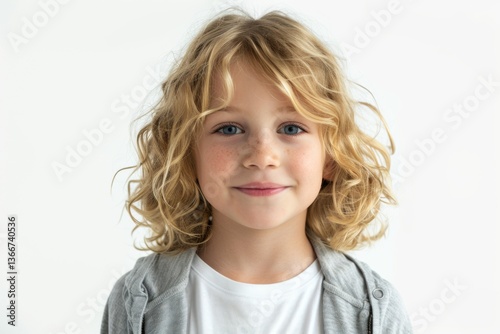Portrait of a young Caucasian girl with blond hair wearing gray jacket over white t shirt against plain white background