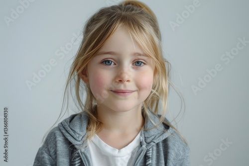 Portrait of a young Caucasian girl with blond hair wearing gray jacket over white t shirt against plain white background