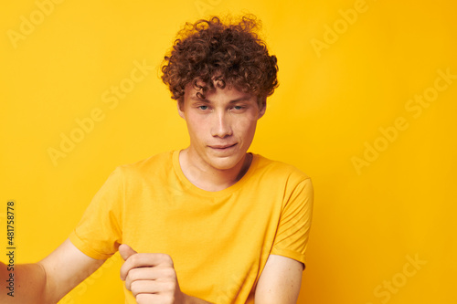 portrait of a young curly man wearing stylish yellow t-shirt posing yellow background unaltered