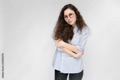 Portrait of a young girl in glasses. Beautiful young girl on a gray background. The girl is holding glasses in her hands. The girl folded her arms.