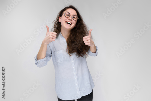 Portrait of a young girl in glasses. Beautiful young girl on a gray background. The girl shows the class sign.