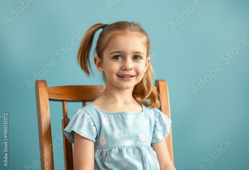 Portrait of a young girl with a rare condition, sitting on a wooden chair