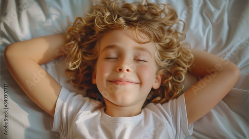 Portrait of a young girl with a sweet smile and captivating eyes, radiating innocence and happiness, in a light blue dress, showcasing the beauty of childhood