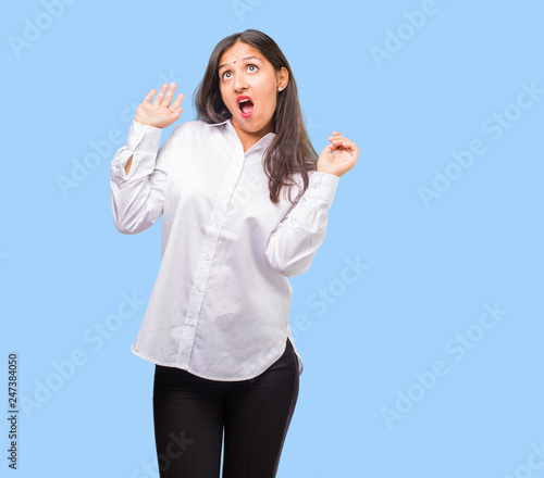 Portrait of a young indian woman crazy and desperate, screaming out of control, funny lunatic expressing freedom and wild