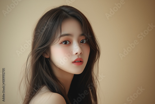 Portrait of a young korean woman indoor setting beauty photography soft lighting close-up expressive emotion