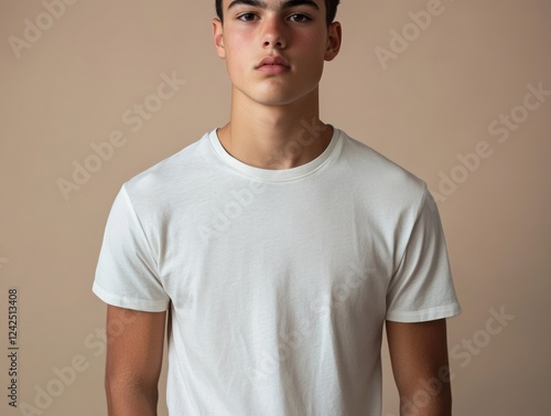 Portrait of a Young Male Wearing a Simple White T-Shirt Against a Neutral Beige Color Backdrop