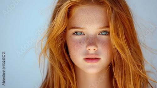 Portrait of a Young Redhead Girl with Freckles and Blue Eyes