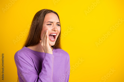 Portrait of a young woman holding her cheek with an expressive gesture against a vibrant yellow backdrop