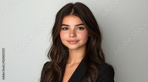 Portrait Of A Young Woman In A Black Jacket Against A Light Gray Background