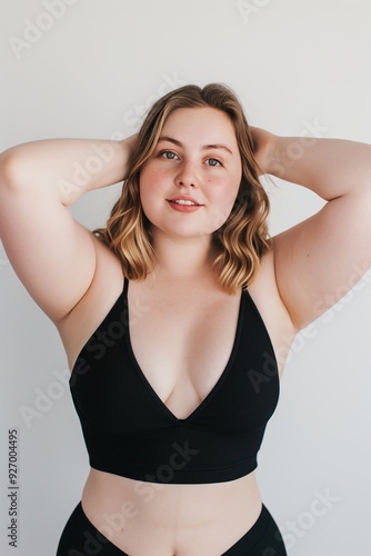 Portrait of a young woman in a black sports bra, with her arms raised behind her head, looking at the camera with a smile.