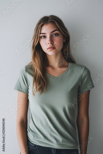 Portrait of a Young Woman in a Sage Green T-Shirt