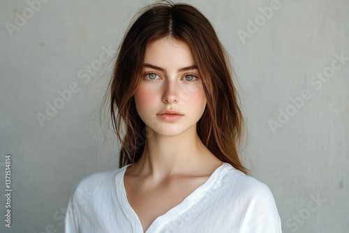 Portrait of a Young Woman in White Shirt on Gray Background Natural Light Serious Expression
