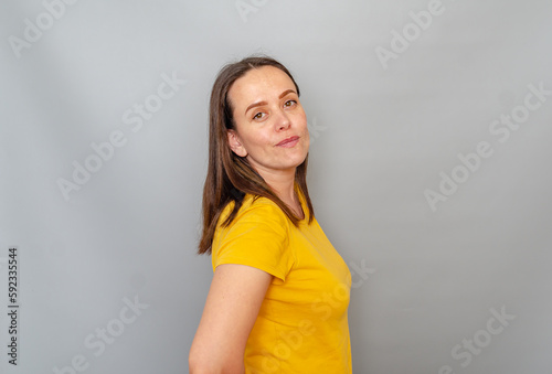 Portrait of a young woman looking up. Yellow T-shirt, Blue Background
