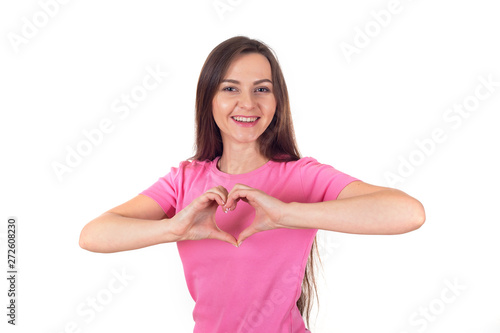 Portrait of a young woman showing a heart gesture with hands isolated on white background.