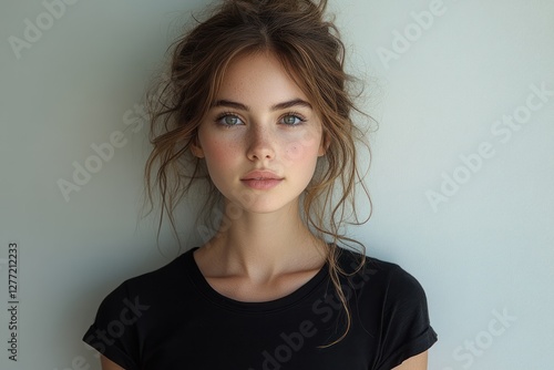 Portrait of a young woman smiling in a black t-shirt against a white background casual elegance