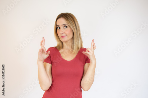 Portrait of a young woman standing over white background, holding fingers crossed for good luck