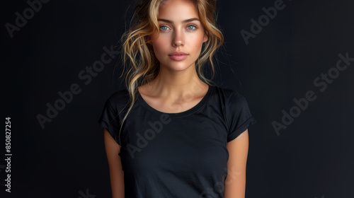Portrait of a Young Woman Wearing a Casual Black T-Shirt Against a Dark Background
