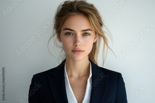 Portrait of a young woman with blonde hair, wearing a dark blue blazer and a white shirt.