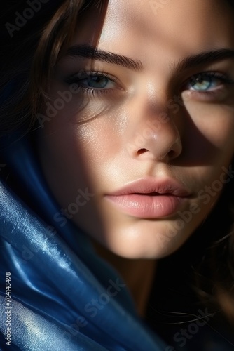 Portrait of a young woman with blue eyes and brown hair wearing a blue scarf