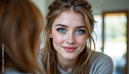 Portrait of a young woman with bright blue eyes indoor setting lifestyle photography natural light close-up view