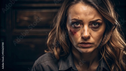 Portrait of a young woman with bruises on her face, dark background. Concept of fighting domestic violence