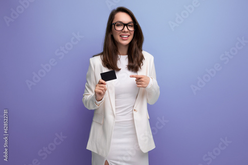 portrait of a young woman with dark hair in a white dress holding a money card for shopping