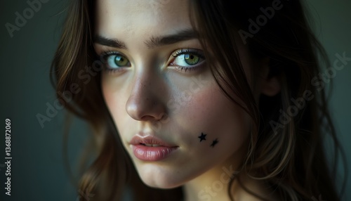 Portrait of a young woman with green eyes and a small star tattoo on her cheek.