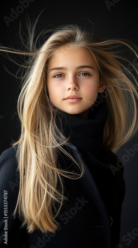 Portrait of a Young Woman with Long Blonde Hair, Wearing a Black Coat
