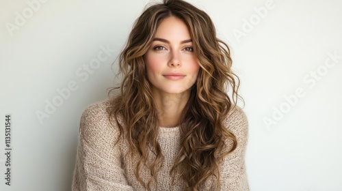 Portrait of a Young Woman with Long Brown Curly Hair Wearing a Beige Sweater