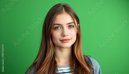 Portrait of a Young Woman with Long Brown Hair Against a Vibrant Green Background: A Captivating Image of Youthful Beauty and Natural Elegance