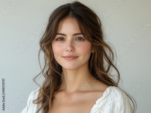 Portrait of a young woman with long brown hair and a subtle smile, wearing a white top against a light background