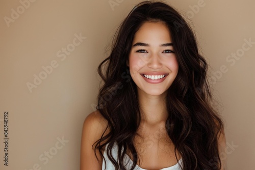 Portrait of a young woman with long dark hair and a radiant smile, captured against a neutral background, highlighting her natural beauty and confident demeanor in a minimalist setting. Generative AI