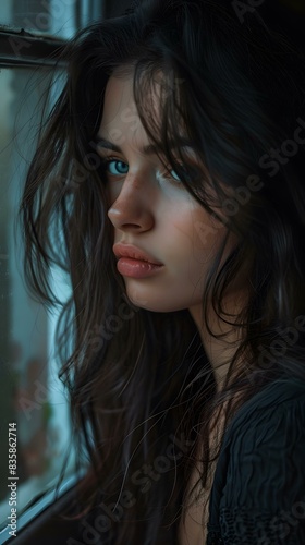 portrait of a young woman with long dark hair and blue eyes