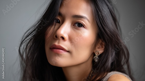 Portrait of a young woman with long dark hair, natural makeup, and elegant earrings, gazing softly at the camera against a neutral background.