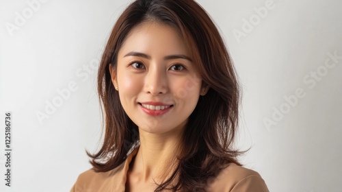 Portrait of a young woman with long dark hair smiling against a light background Copy Space